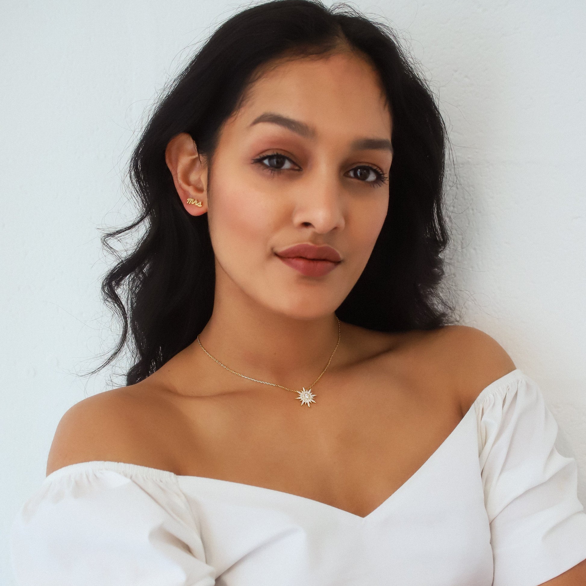 Our gorgeous Ettie Mrs Studs are the perfect understated, yet fun, style for the bride. Crafted in Gold Plated 925 Sterling Silver with sparkling pave crystals creating the shape of the word 'mrs'.
