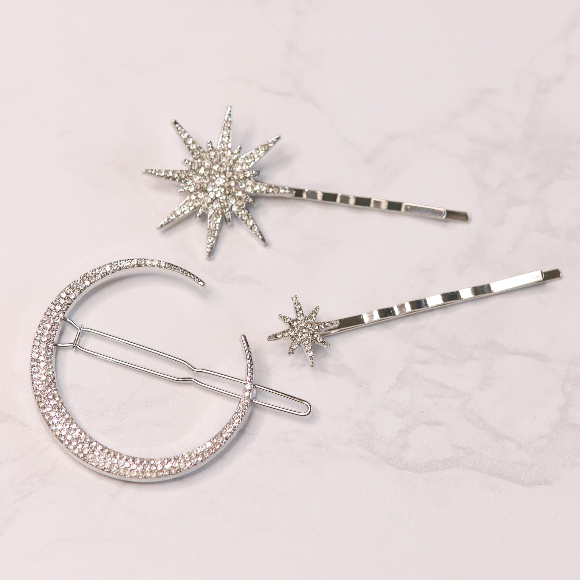 Be inspired by the night sky! Absolutely stunning trio of crystal paved hair clips featuring celestial moon & star design. If you love to make a statement then these are the accessories for you, paired especially well with a glass of Champagne!