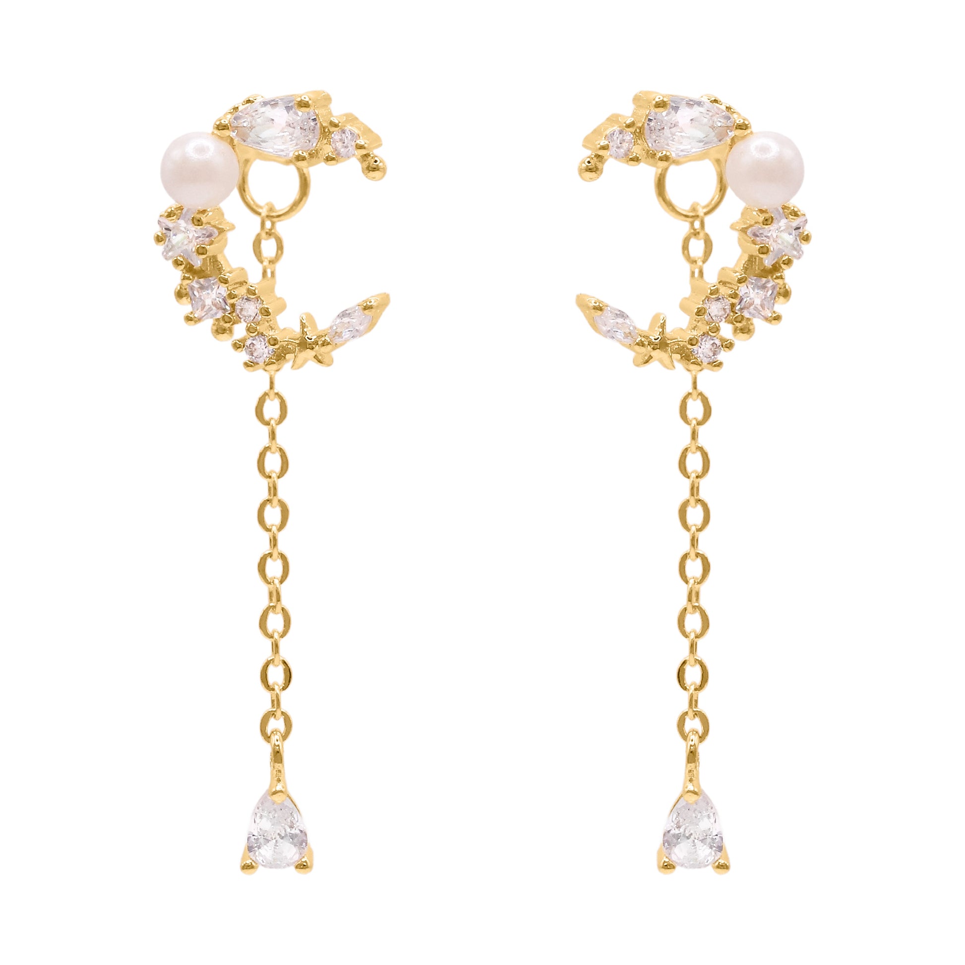 The Sabrina Earrings are made for your moonlit moments. Featuring a crescent moon encrusted with sparkling cubic zirconia, a tiny pearl, and a delicate drop chain hanging from the butterfly back that catches the light with every step.
