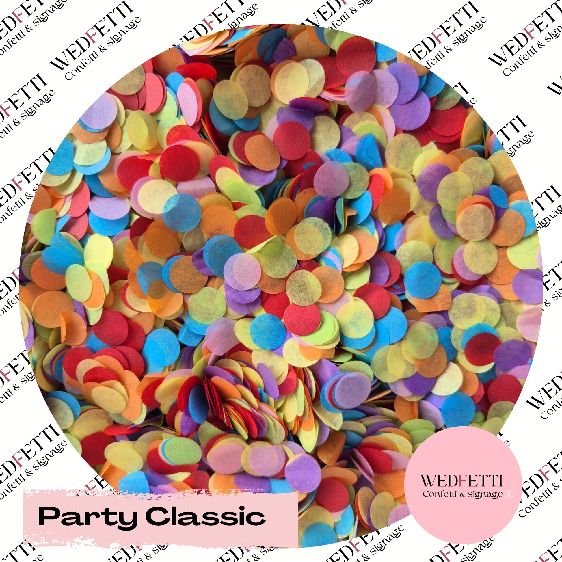 Slow falling, Biodegradable paper Confetti circles that are 1.5cm in diameter, you can either purchase in single servings which are either Small, Medium, and Large servings, or available to purchase in weighed grams.