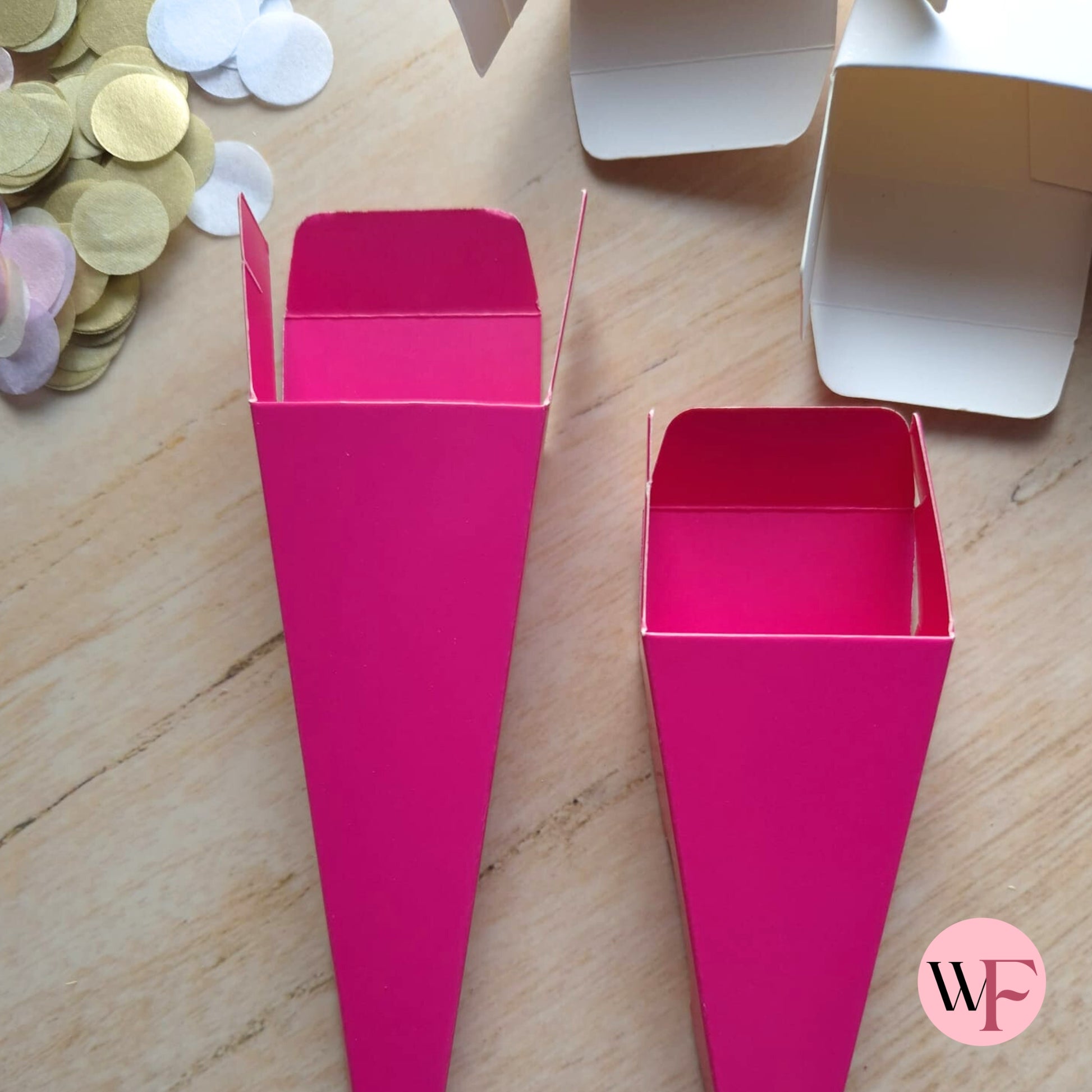 These cones are most suitable to hold paper confetti, especially if using your confetti outside, the closable lid will prevent any paper confetti from potentially blowing away. The small size cone will hold between 1-2 grams of confetti and the medium size cone will hold between 2-3 grams of confetti, they will be shipped to you flat packed so will need assembling and filling before use. These cones are unfilled, Confetti will need to be purchased separately. A choice of 3 colours are available, Fuschia pink, White, and Kraft brown. Perfect for small servings of paper Confetti.