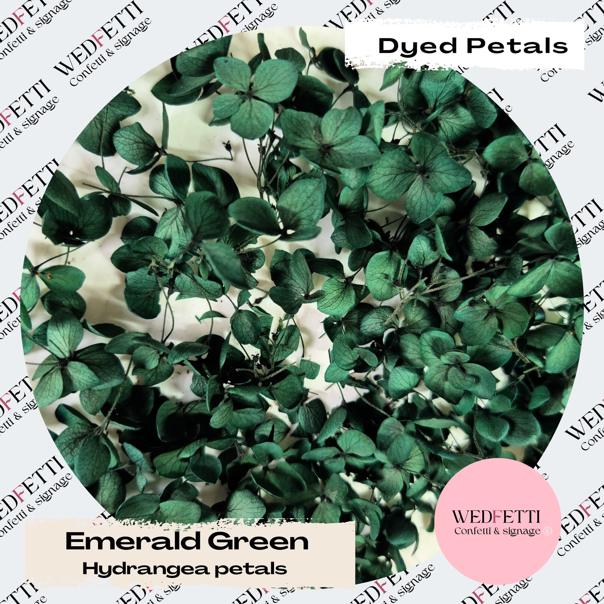MED SLOW FALLING, PICTURESQUE This product offers a beautiful Emerald Green shade of dyed hydrangea petals, extremely light & delicate, creating a colorful and natural confetti option. These real petals are biodegradable, making them an eco-friendly choice for any event, while also providing a stunning visual display.