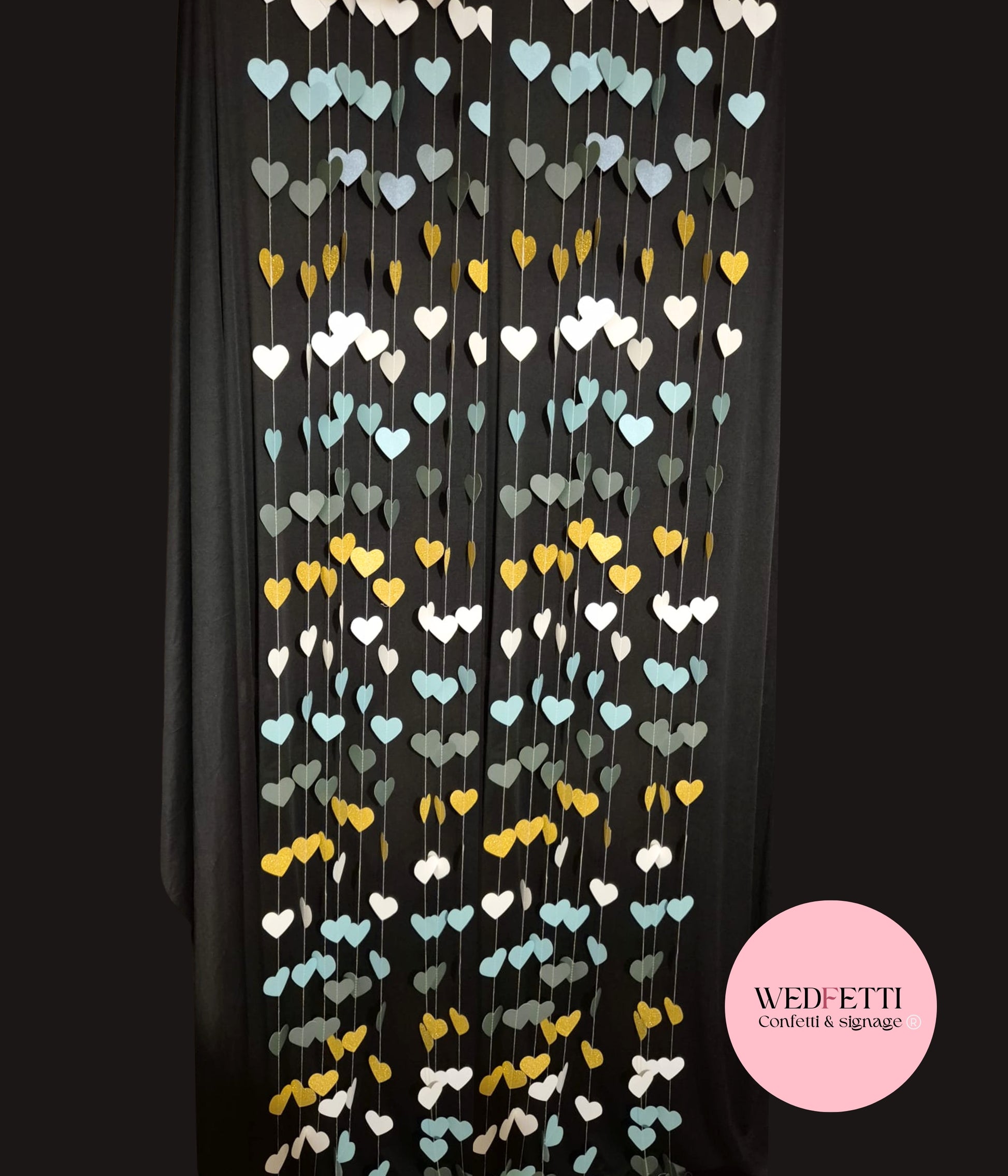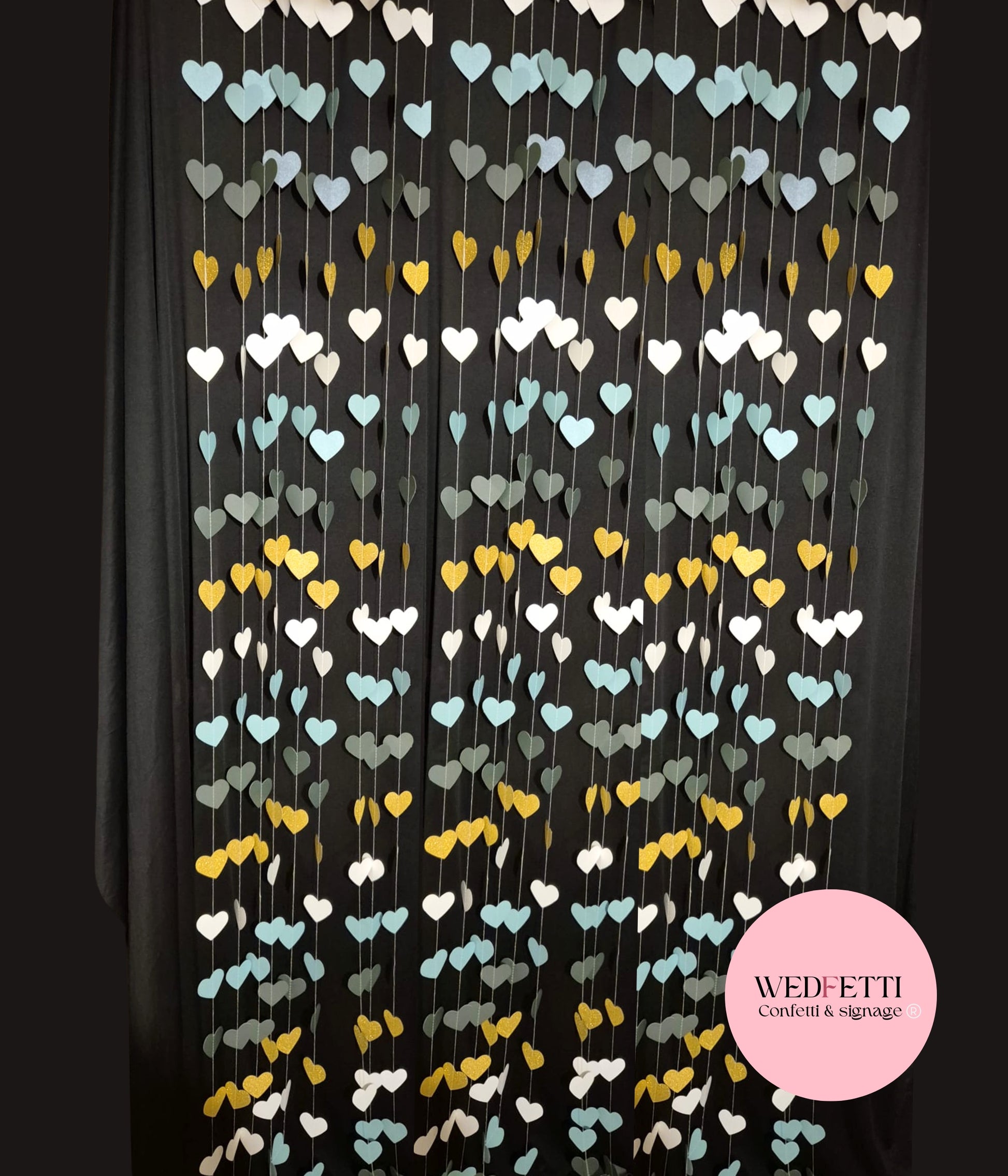 Transform your celebration with this versatile paper heart Confetti curtain. Available in 4 meter lengths perfect to be hung from ceilings. These lightweight strands create an instant festive backdrop that's easy to customize. Layer multiple curtains to achieve your desired width and impact, perfect for photo booths, ceremony arches, or venue entrances. The sage gold palette complements any wedding aesthetic while maintaining that premium, editorial feel. Biodegradable paper construction ensures your celebration is as responsible as it is beautiful.
