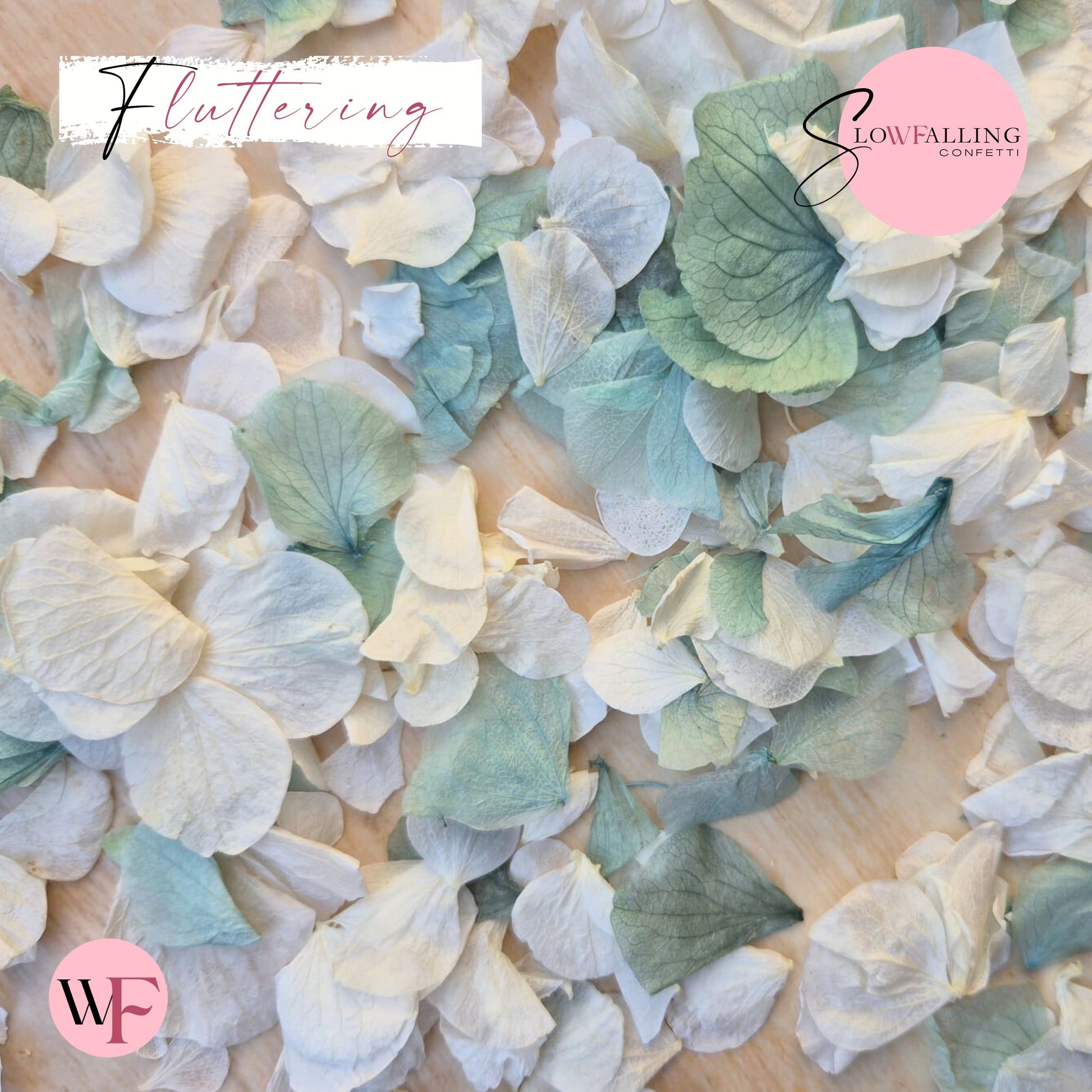 SLOW FALLING, FLUTTERING, PICTURESQUE This product offers a beautiful  blend of Turquoise shade hydrangea petals with white ivory, extremely light, floaty, fluttery & delicate, creating a colorful and natural confetti option. These real petals are biodegradable, making them an eco-friendly choice for any event, while also providing a stunning visual display.