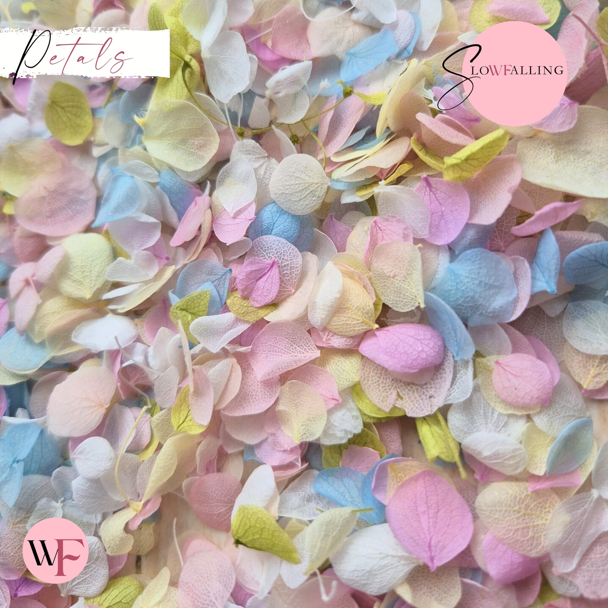 SLOW FALLING, PICTURESQUE This product offers a beautiful  blend of hydrangea petals, inspired by Wedfetti's "pastel party paper mix" Extremely light, floaty, fluttery & delicate, creating a perfect natural confetti option. These real petals are biodegradable, making them an eco-friendly choice for any event, while also providing a stunning visual display.