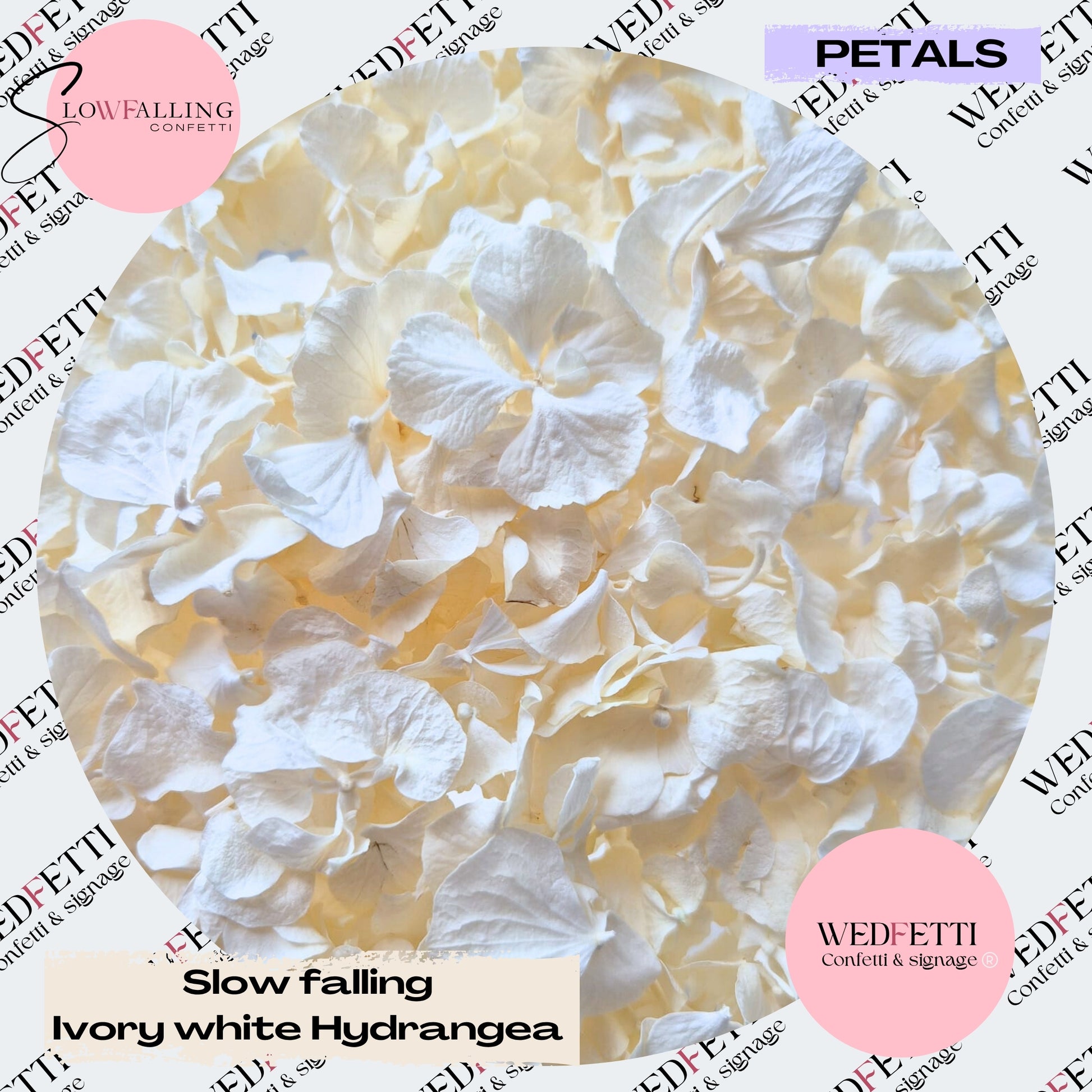Extremely SLOW FALLING, FLUTTERING, PICTURESQUE This product offers a beautiful crisp blend of white Ivory hydrangea petals, extremely light, floaty, fluttery & delicate, creating a colorful and natural confetti option. These real petals are biodegradable, making them an eco-friendly choice for any event, while also providing a stunning visual display.