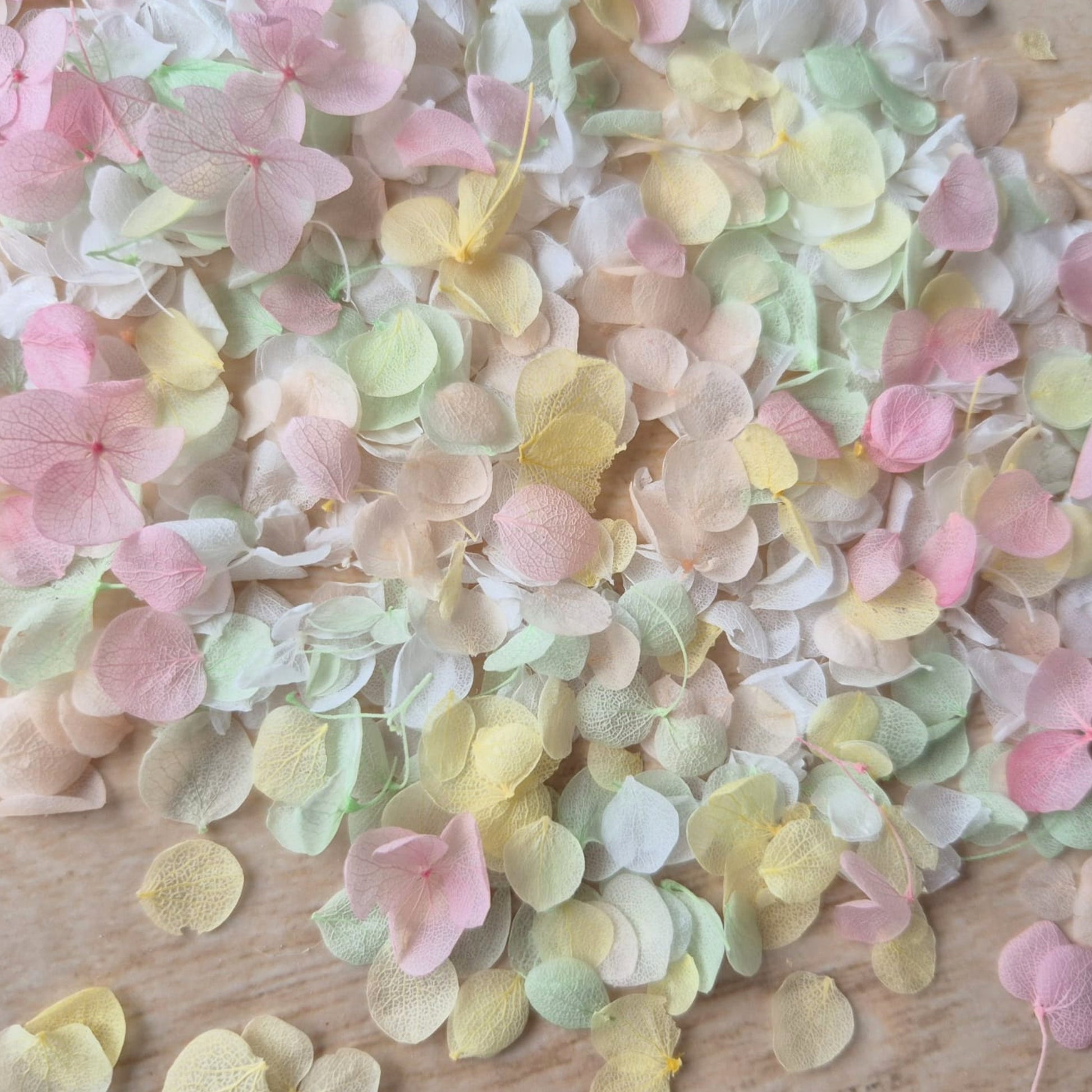 SLOW FALLING, PICTURESQUE This product offers a beautiful  blend of hydrangea petals, inspired by Wedfetti's "pastel party paper mix" Extremely light, floaty, fluttery & delicate, creating a perfect natural confetti option. These real petals are biodegradable, making them an eco-friendly choice for any event, while also providing a stunning visual display.